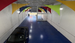 O galpão é dividido em dois níveis: Pavimento principal com 219,39m², Pavimento inferior com 205,61m², pé-direito de 6,90 metros, ideal para armazenamento e atividades operacionais